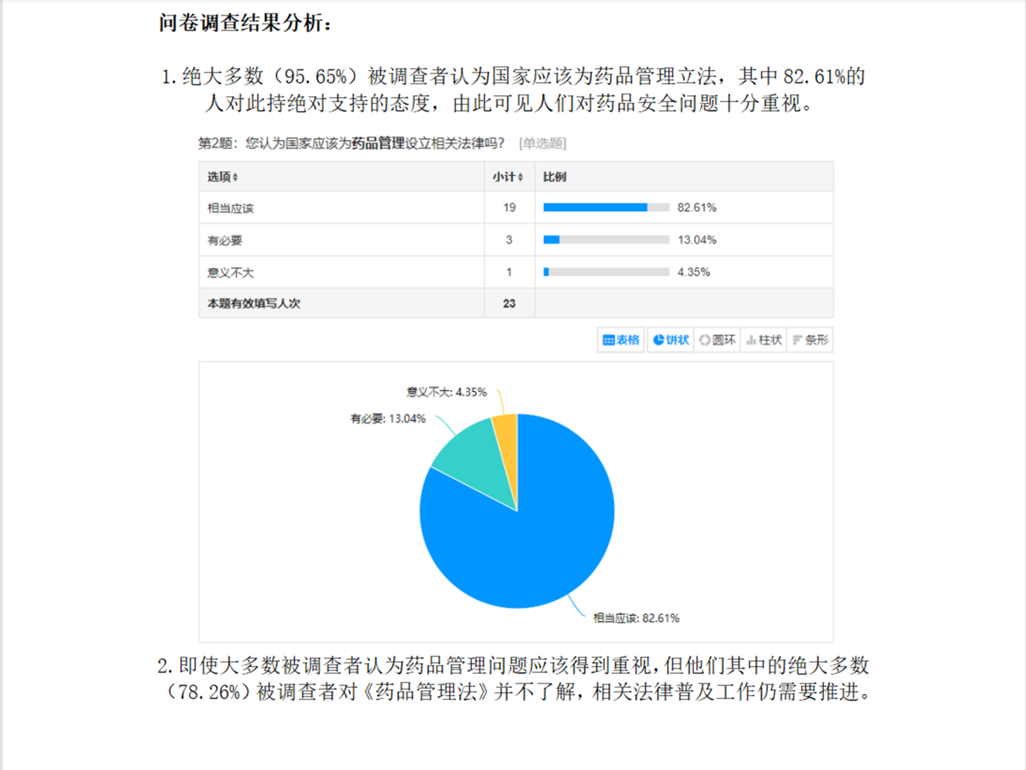 往后几日,团队完成了调研问卷的发放与结果收集,并对收集到的几十余份结果进行了分析讨论。分析认为,在问卷给出新版《中华人民共和国药品管理法》的相关处罚条例同时被调查者亲自计算了相关案例的处罚金额后,超过半数的人认为在现行法律条件下,药品生产经营者的违法成本极高;所有被调查者均认为现行《中华人民共和国药品管理法》或多或少会对药品行业的规范管理起到积极的影响作用,更有部分被调查者认为新法严厉的违法追责能大力助推行业规范化发展,群众也将能够更加信任业内药企及相关从业人士。