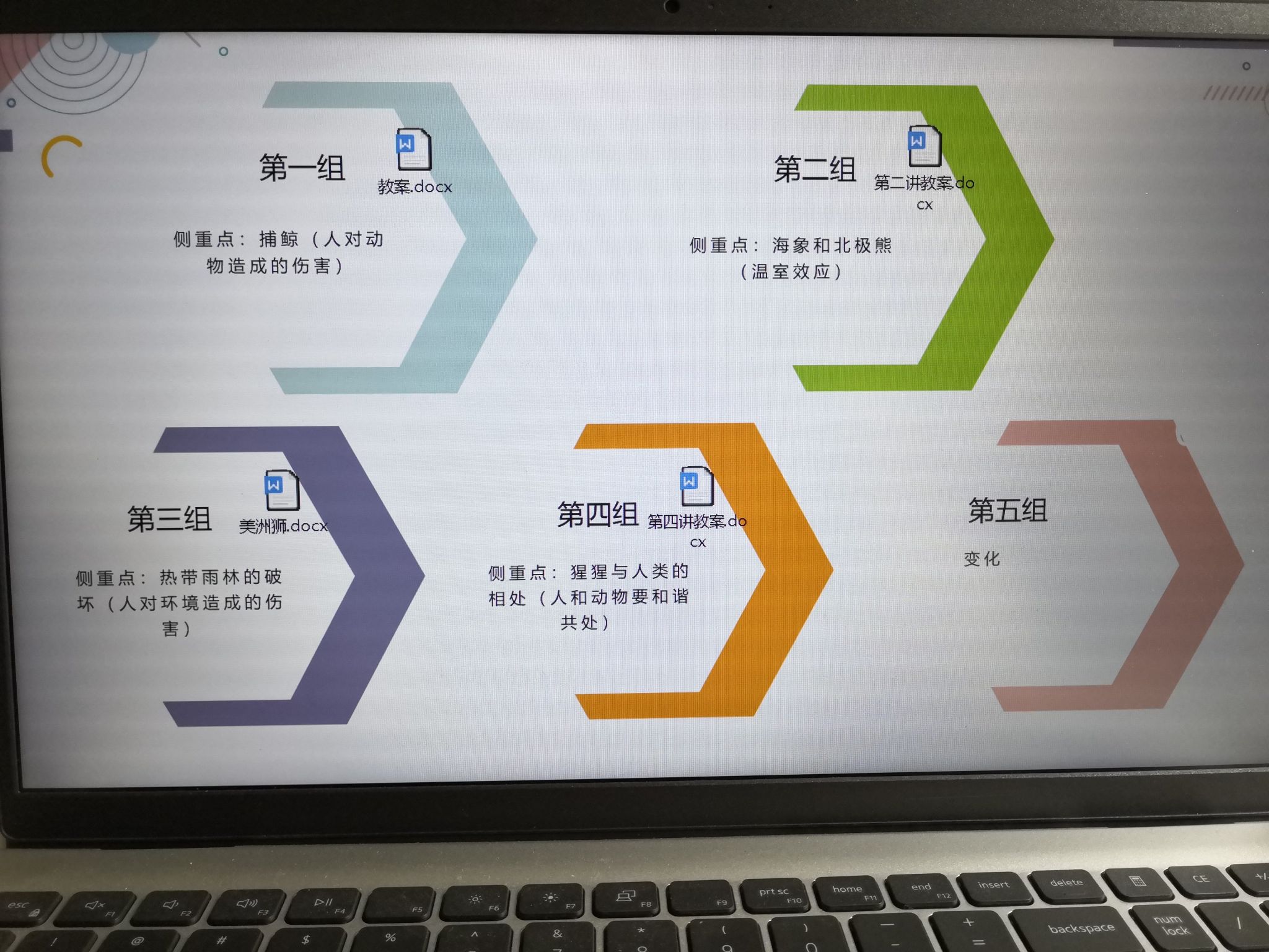 在课程准备期间,团队多次商讨,分为5个课程小组分别围绕各大洲的特色进行选材,并在课程中采用动物之间对话的情节的形式引入课程,使课程更加生动形象,以提高小朋友们的兴趣。最终,确定以南极洲的捕鲸站对鲸鱼的威胁、北极海象及北极熊因温室效应失去家园为课程内容。