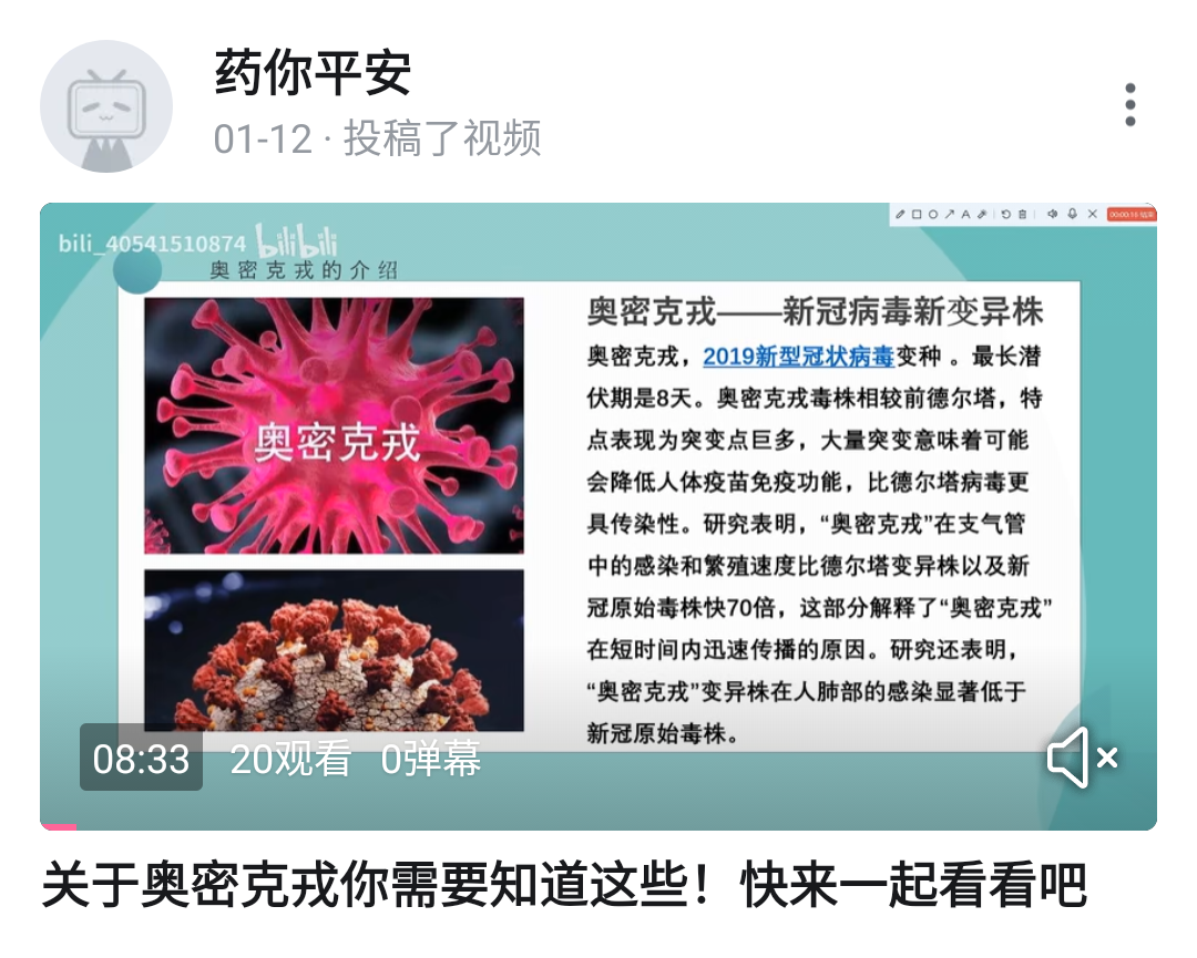 活动具体内容如下:团队于12月26至29日做了4次线上表单调研,表单内容包括本人对新冠肺炎相关问题的认识和了解、疫情期间相关药品的认识和了解、安全用药知识的认识和了解以及对目前新冠肺炎的认识与科普。通过对当下疫情开放时期大家预防和应对的新冠的表单调研,发现大部分居民都会在家自备感冒清热类药物,对于网络上治疗新冠的特效药也会先提前了解疗效再考虑是否购买。纵使在疫情防控放开的当下,大家也会做好相应的预防措施,大部分人出门仍旧会佩戴口罩。调查结果显示,大部分人都有感染过新冠的经历。感染新冠后会出现以下症状:咳嗽、呼吸不畅、四肢无力、发热、胸闷等。同时由于新冠是肺部病毒,所以大家如果感觉呼吸困难的话还是建议到医院直接就诊。此外,打过加强针的居民开始对于病毒的耐受性更好,但是随着时间的推移效果也会越来越不明显。总而言之,大家注意个人防护能很大程度上避免二次感染新冠。随后团队根据调研结果做了2个相关PPT,“新冠预防与科普”和“关于‘奥密克戎’你需要知道”,并录制了网课视频对PPT进行讲解,视频将会上传于哔哩哔哩进行科普宣传。