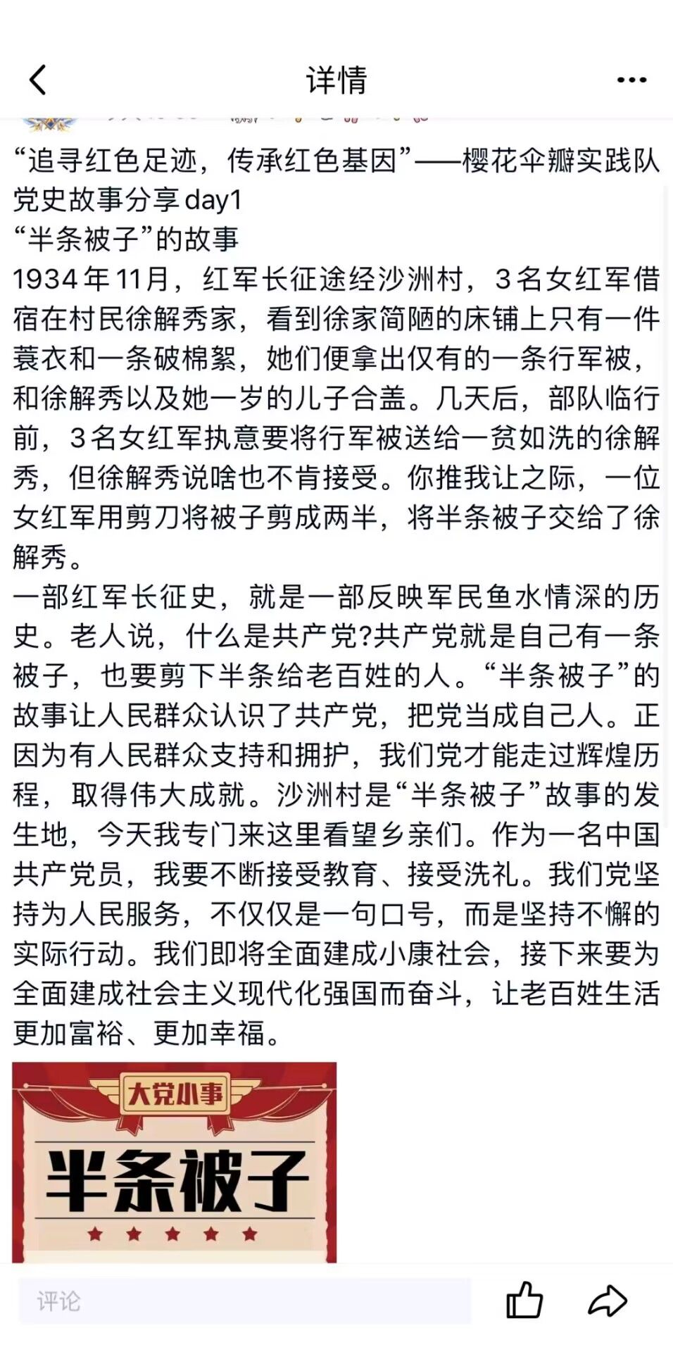 红色,是鲜活生命力的代名词,是五星红旗自由飘扬的底气,是希望是力量是欣欣向荣屹立不倒的中国。追寻红色足迹,传承红色基因是每个中华儿女义不容辞的责任。行程万里勿忘初心,“樱花伞瓣”实践团队于2023年1月13日开展了“追寻红色足迹,传承红色基因”社会实践,活动于1月23日圆满落幕。本次社会实践由线上问卷调查、每日总结、党史空间分享以及党史视频观看四个部分组成。