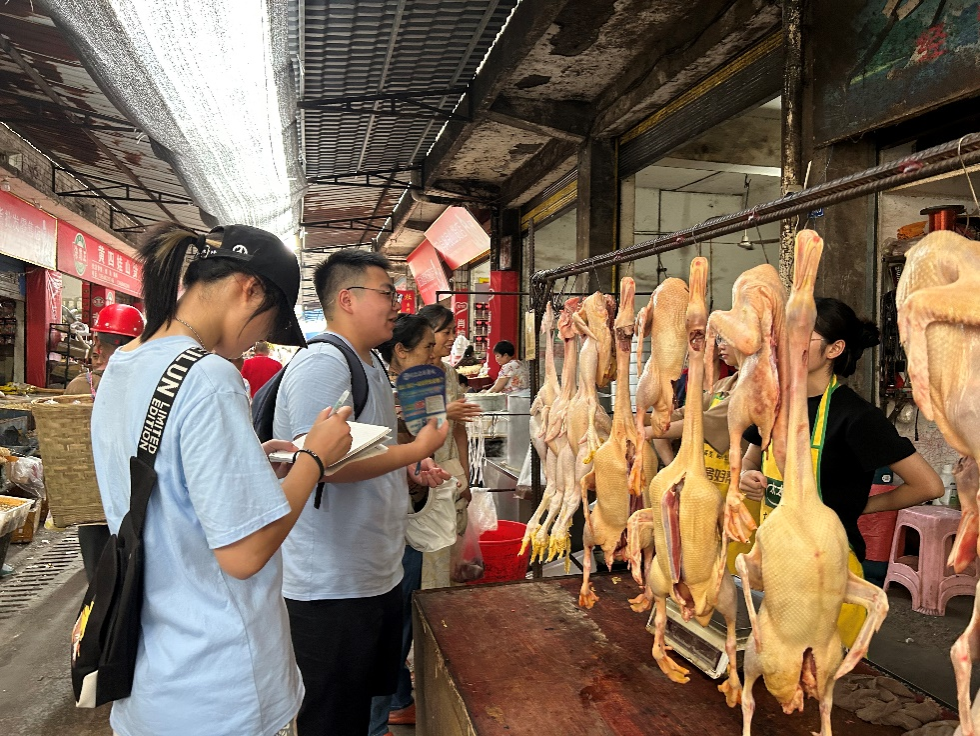 在与政府工作人员沟通后,团队成员于7月12日上午前往隆昌黄家镇农贸市场展开关于禽类收入、宰杀、售卖等相关流程的市场调研。