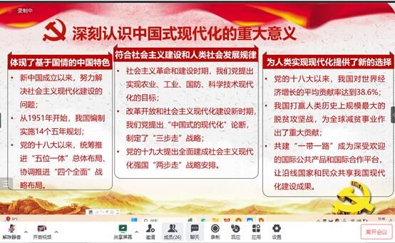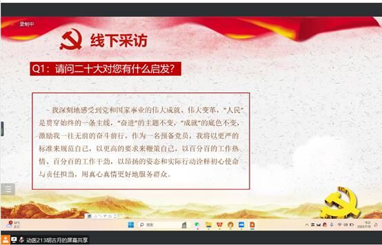 此前分队成员已经进行了理论学习、线上问卷调研、线下随机采访等环节并有所收获,于是分队集结组员13人并召集青年群众12人举行腾讯会议,共同弘扬党的二十大精神。郑长忠所著文章中提到,青年是面向未来的最具革命性和创新性的群体,青年发展又深受时代和社会影响。因此本次宣讲会的目的是推动青年群众学习弘扬党的二十大精神,让党的二十大精神不断指导青年工作。本次宣讲会上,13名组员根据此前的理论学习、线上线下调研情况确定了不同的主题,依次提出了各自的建议。其中来自动医202103的胡古月以“学习贯彻党的二十大精神”为宣讲主题进行发言:“我理解的党的二十大精神是对于自己的学习、兴趣和目标保持热情和激情、具备实现目标的动力和决心,面对困难时能够坚持不懈、相信自己的能力和价值,树立积极的自我形象、不断追求知识和学习新事物。”来自动医202003的曹栋才则以“青年对于党的二十大精神的诠释”为切入点,从爱国主义、集体主义、社会主义、探索创新分别进行探讨,他认为新时代的青年肩负着实现中华民族伟大复兴的重任,同时也要继承和发扬党的二十大精神,秉持爱国主义、集体主义、社会主义和探索创新的理念,努力成为建设美好社会的奋斗者。正如习近平总书记所说:“我们广大青年要坚定不移听党话、跟党走,怀抱梦想脚踏实地,敢想敢为、善作善成,要立志做有理想、敢担当、能吃苦、肯奋斗的新时代好青年,让青春在全面建设社会主义现代化国家的火热实践中绽放绚丽之花。”随后,动医202004的李泓霓发表了关于党的二十大精神的感悟见解。据悉,一名参加本次宣讲会的群众张思行认为这次宣讲会不仅加深了他对党的二十大精神的认识,同时也让他重拾锲而不舍的求知精神,他将在今后的学习工作中不断践行党的二十大精神,为社会主义事业不断奋斗。