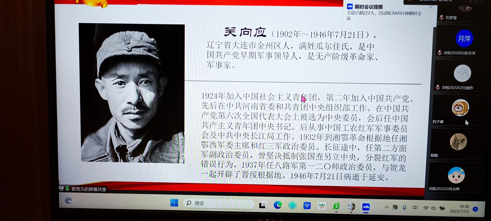 7月23日,队员宋红敏等根据前期线下实践成员收集到的资料,制作学习PPT并在队内宣讲。整个内容包括八位革命英雄的简介与故事,有弃医从文、以笔为矛的鲁迅先生,也有强忍疼痛、坚持指挥作战的萧望东同志。队员岳柯君写下“他们有的是众人皆知的革命战士,有的是少为人知的战斗先锋,无论是否广为人知,他们都在用自己的力量守护着国家和人民。”的感想。