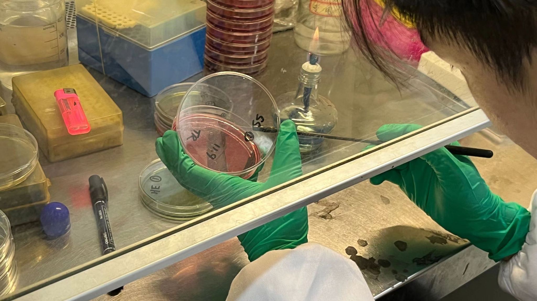图为科研兴趣小组成员唐睿在对实验样品进行平板划线