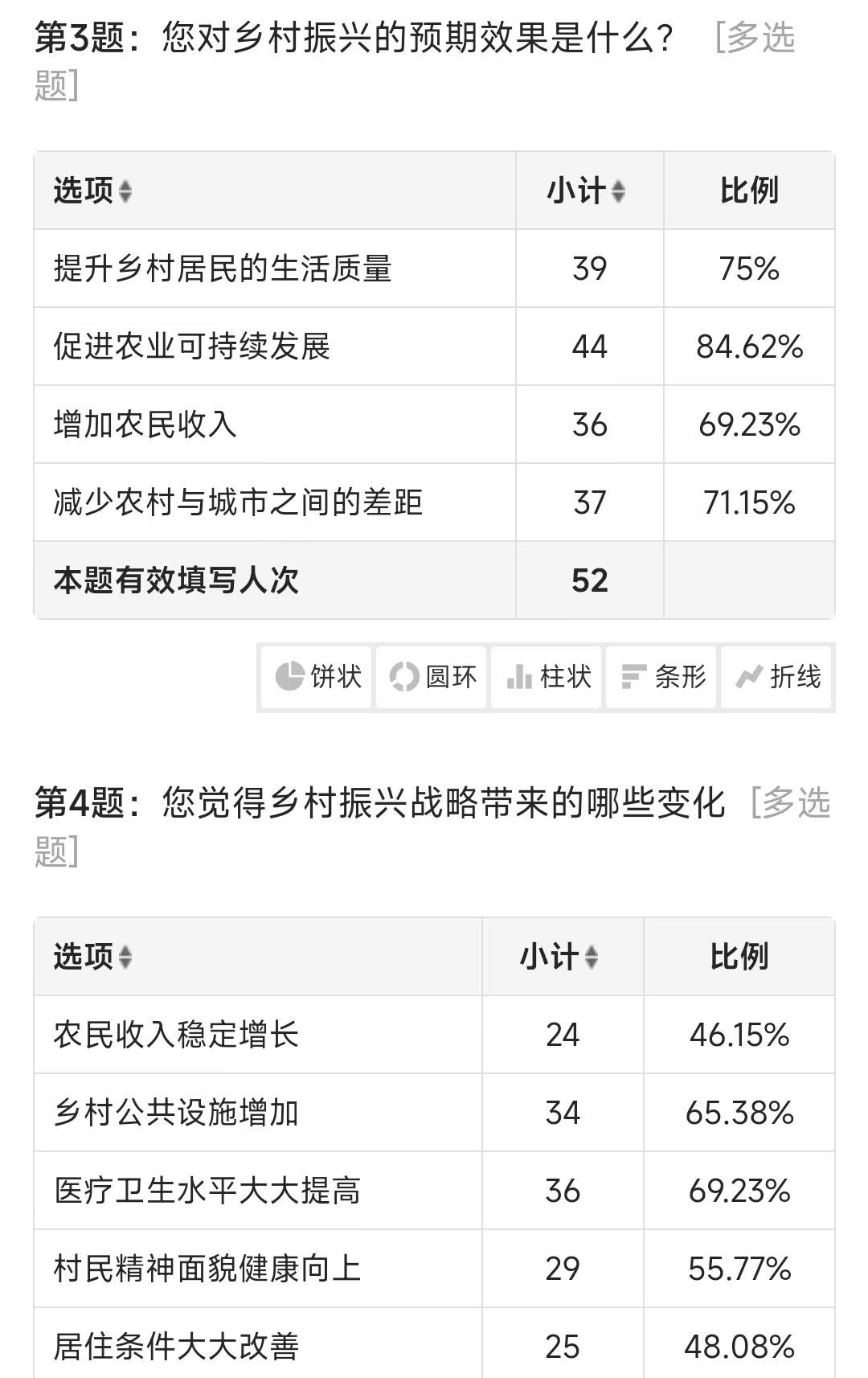 本次调研活动共收集到50余份有效问卷,调查问卷结果显示参与调研的群众均认为乡村振兴非常重要,并对开展乡村振兴战略以来所产生的变化有一定的了解,主要包括乡村公共设施增加、居住条件大大改善以及医疗卫生水平提高等,但有54%的答题者表示畜禽养殖产业助力当地农村发展的效果一般。针对这一现象,团队继续深入调研,结果显示有73%的答题者认为当地畜禽养殖受限的主要因素是基础设施落后,也有52%的答题者认为主要原因是缺乏技术人员。由此可见,在本次调研的地区中,畜禽养殖产业助力乡村振兴的效果有待提升,相关技术人员的需求度也较大。