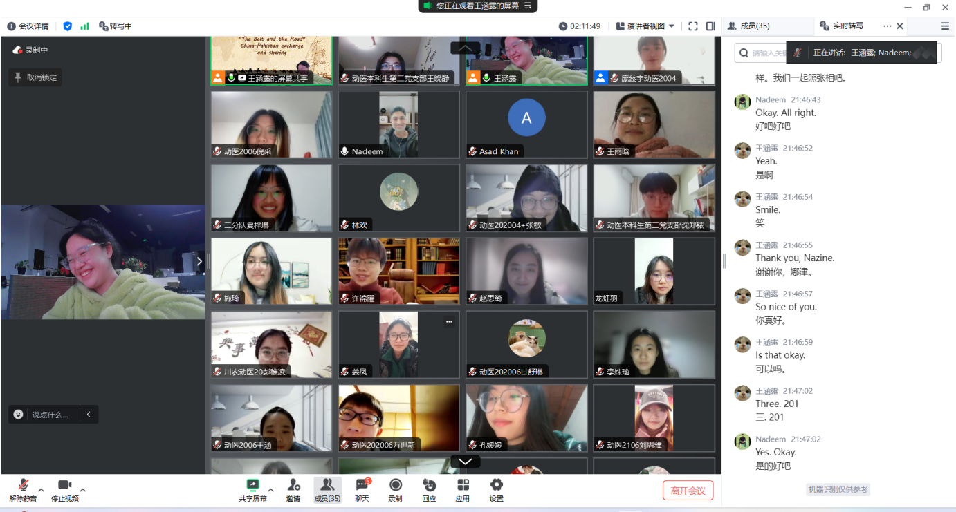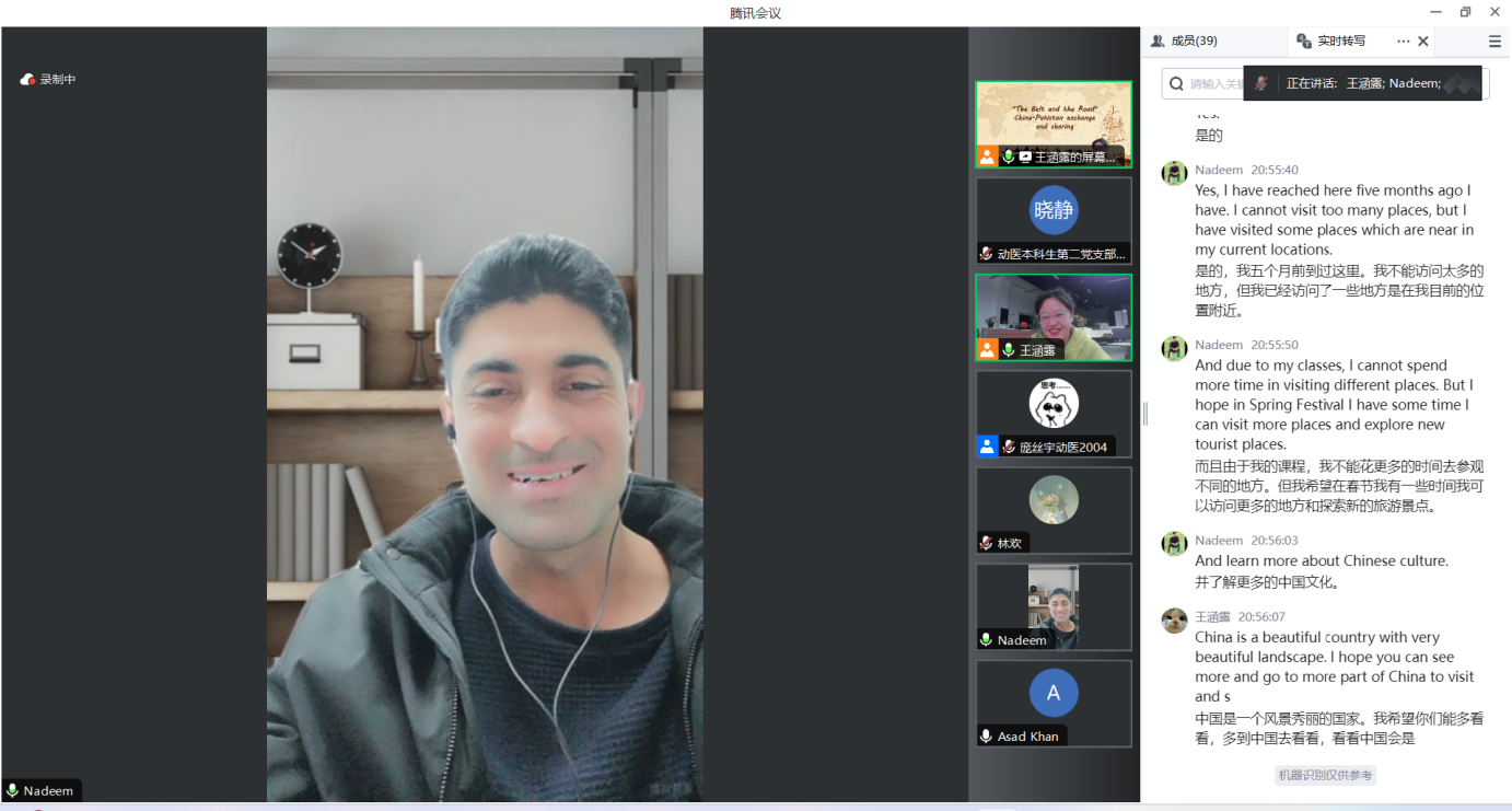 王涵露在交流中积极表达:“我希望未来会更光明,我也相信未来一定会更光明,我们作为年轻一代会有更多交流合作。”巴基斯坦留学生Zoya也表达了对中国的感谢:“我们正在讨论的关于中巴‘一带一路’的交流共享,比如我们提到的基础设施、网络和交通等,都证明了中国和巴基斯坦真诚的友谊,我想说‘我们爱中国,中国人总是帮助我们。’”同时,宣讲员王晓静通过腾讯会议平台开展了两次线上宣讲会,累计参会人员106位,收集有效问卷87份。问卷结果显示,97%以上的参会人员通过宣讲对“一带一路”有了更加深入的了解,超过四成的人员对“一带一路”未来发展持有积极态度。
