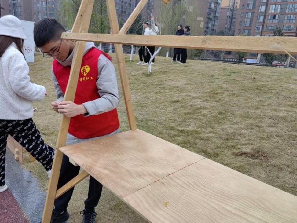 3月9日上午,动检202301班的七位志愿者提前到达了杏林社区居委会服务中心,在社区工作人员的安排下有序地进行集市义卖活动的准备工作,为活动场地搭建摊位的同时进行宣传工作。志愿者们耐心地来回搬运着活动摊位所需的支架、木板等材料,并在场地中搭建起数十个摊位。即使搬运和工作量较大,几位志愿者们仍一丝不苟地完成了准备工作。
