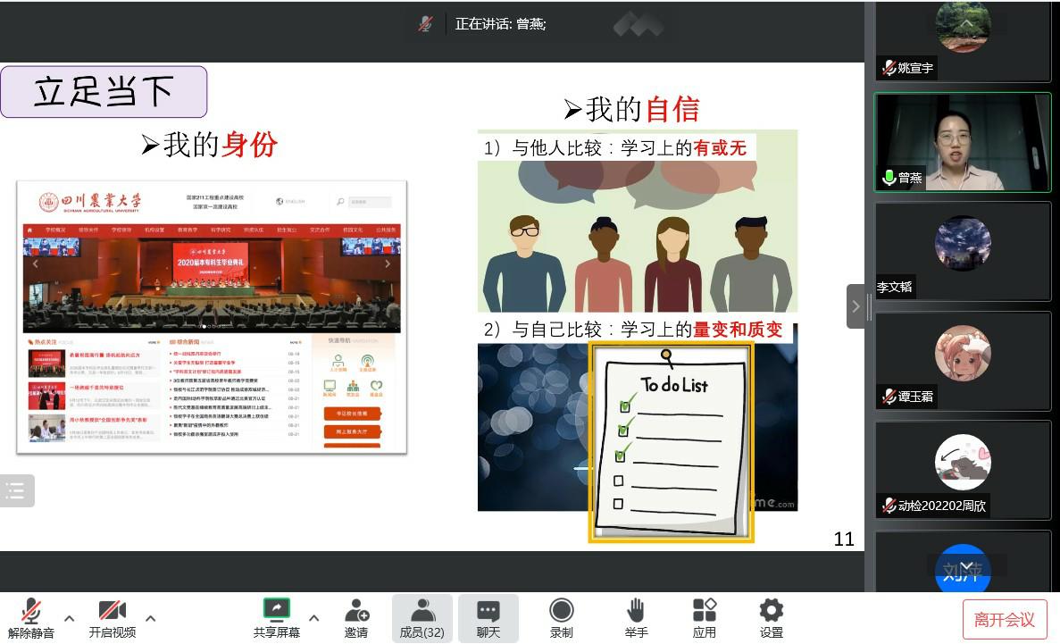 班主任曾燕以“认识”、“态度”、“感恩”等关键词展开,引导同学们正确认知高中与大学在学习上以及自我发展上的不同,引导同学们正视自己的学习初衷,仔细思考未来希望的发展规划;同时也告诉同学们,要树立正确的态度,要努力尝试,积极的、自信的、有规划的安排自己的学习和生活,但同时也要有强大的心脏接受突发的不完美,对待未知的困难以及恐惧等要学会求助,大胆往前走,相信自己的学习能力。