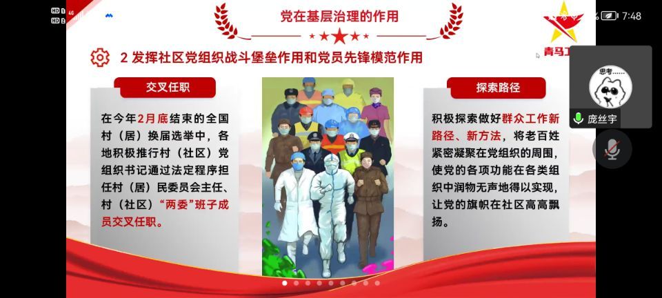 在这一部分,主持人也分享了党的青年工作实例,践行入党誓词不忘初心,毅然奔赴疫情前线的急诊医生吴豪杰,毅然返乡扎根基层的大学生村官陈蔓,战斗在基层一线无悔奉献十年青春的青年党员干部刘仙玉...这些党的青年工作者为支部成员指明了方向——向前辈学习,向榜样学习。