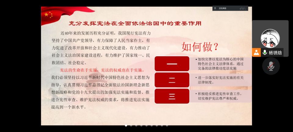 “学宪法,讲宪法”专项活动中,主持人讲解了宪法的制定以及完善发展历程,并重点强调“宪法的生命在于实施,宪法的权威也在于实施”。活动中支部成员通过法治故事与案例深入学习与了解习近平法治思想的重要意义、丰富内涵与核心要义等内容。
