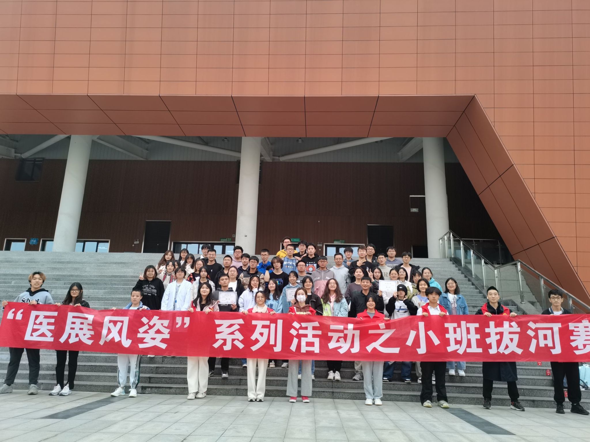 决赛结束后,体育与素拓部向前三名队伍颁发了奖状,并与四强队伍进行了合影。在一片欢呼声和笑声中,“医展风姿”系列活动之小班拔河赛正式落下帷幕。