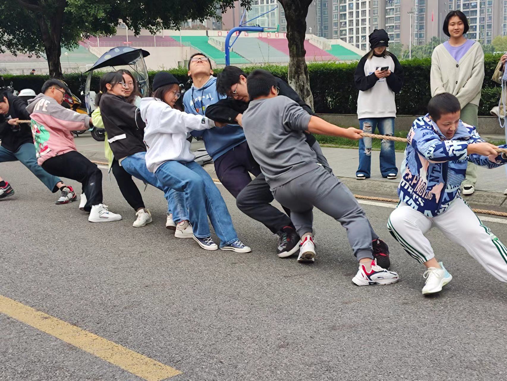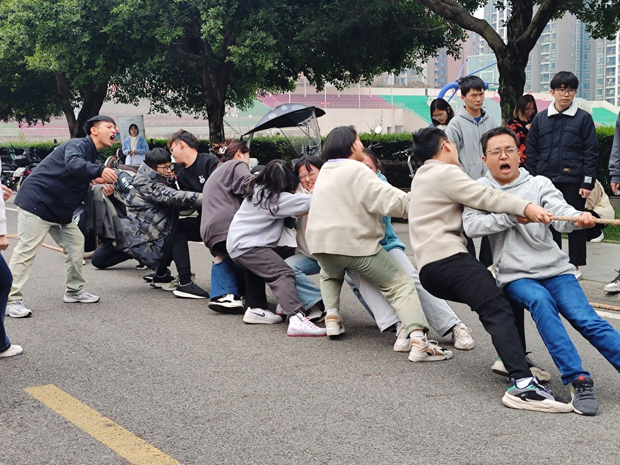 11月18日中午,成都校区东二门主干道上正进行着精彩的拔河赛,一阵阵口号声响彻科创中心与篮球场,引来不少过路人好奇的眼光。2022年“医展风姿”系列活动之小班拔河赛的半决赛与决赛正在此开展,学生组织代表队、动医202202班、药剂202201班和动检202202班进行了激烈比拼。