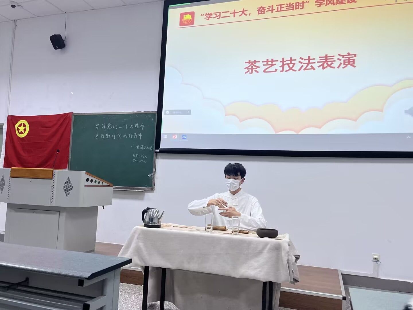 值得一提的是,本次团日活动的学风建设部分邀请到书画协会成员和茶学专业的马子涵进行现场表演。由书画协会成员书写的横幅作品“清澈的爱,只为中国”不仅将党的二十大精神和学风建设相结合,更显示出吾辈青年的思想觉悟。伴随着悠扬空灵的中国古典乐,马子涵的茶艺技法挥洒自如,与行云流水的琵琶声交织出本次活动的完美句号。表演结束,现场掌声久久不息。