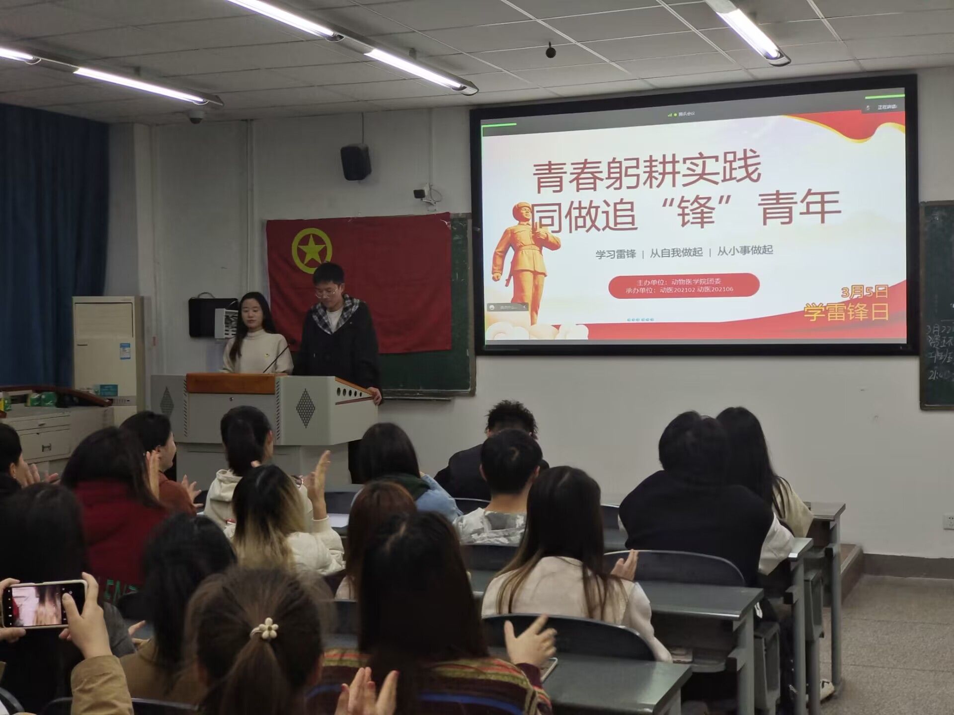 在3月22日晚七点半,动医202102、动医202106班合办的“青春躬耕实践,同做追‘锋’青年”三月团日活动在4-B209顺利开展。