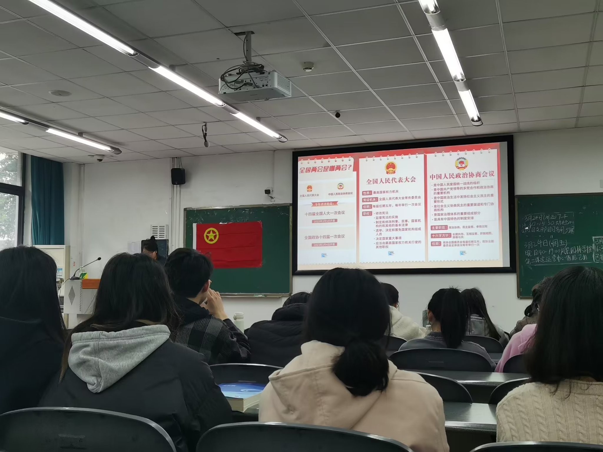紧接着,主持人施佳琪带领成员们学习“团结奋进新征程”两会专题学习,向支部成员介绍了全国两会——全国人民代表大会和中国人民政治协商会议的发展历史和今年两会的新亮点。习近平总书记在十四届全国人大一次会议发表了要坚持人民至上、扎实推进“一国两制”等重要讲话,始终贯彻以人为本的原则,确定了我国如今的发展方向。