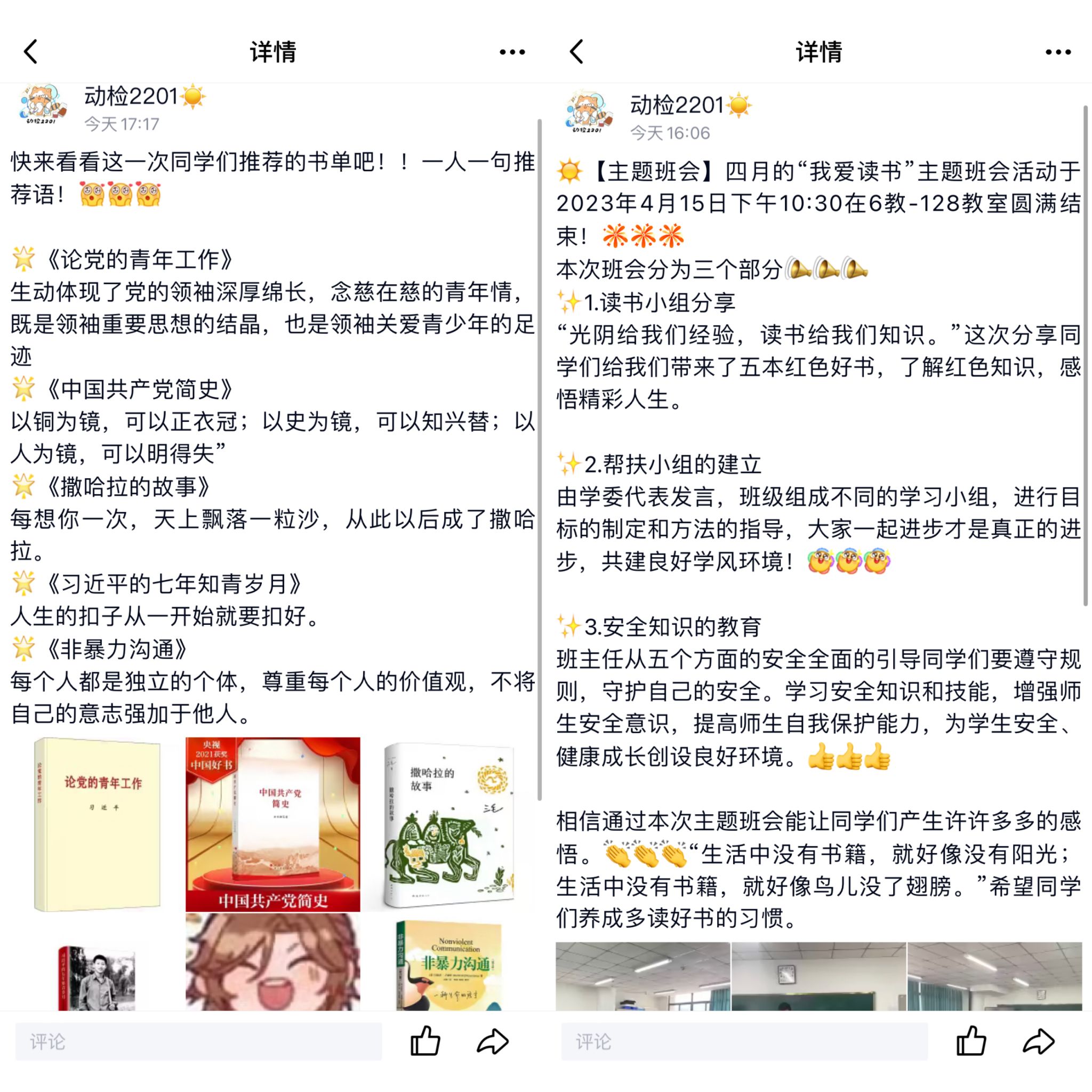4月14日,动检202201团支部在6教128教室举行了“我爱读书”四月主题班会。本次班会分为“读书分享”、“学习小组报告”、“安全知识教育”三个部分。