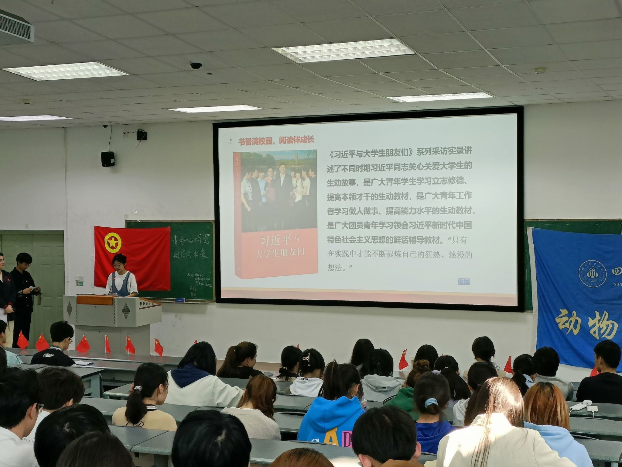 书香满校园,阅读伴成长。两位主持人在为期一周的流动书箱里的便签纸中随机抽取了7本书籍。主持人邀请了对这些书籍了解的同学上台为每本书籍进行详细介绍和阅读感悟,其中一位同学在介绍《习近平与大学生朋友们》这本书时,提到新青年应将个人理想同国家命运、人民群众需要联系起来,把青春的小我融入国家和人民的大我中,让青春于祖国最需要的地方焕发绚丽色彩。这些书籍的讲解营造了浓浓的书香气息,促进了大家对书籍阅读的渴望。接着,在两位主持人的带领下,现场的观众进行了知识竞答,现场的青年团员踊跃抢答,尽显川农学子心系国事,苦读摹写渊博。最后,伴随着齐唱团歌的结束,本次的班团活动落下帷幕。
