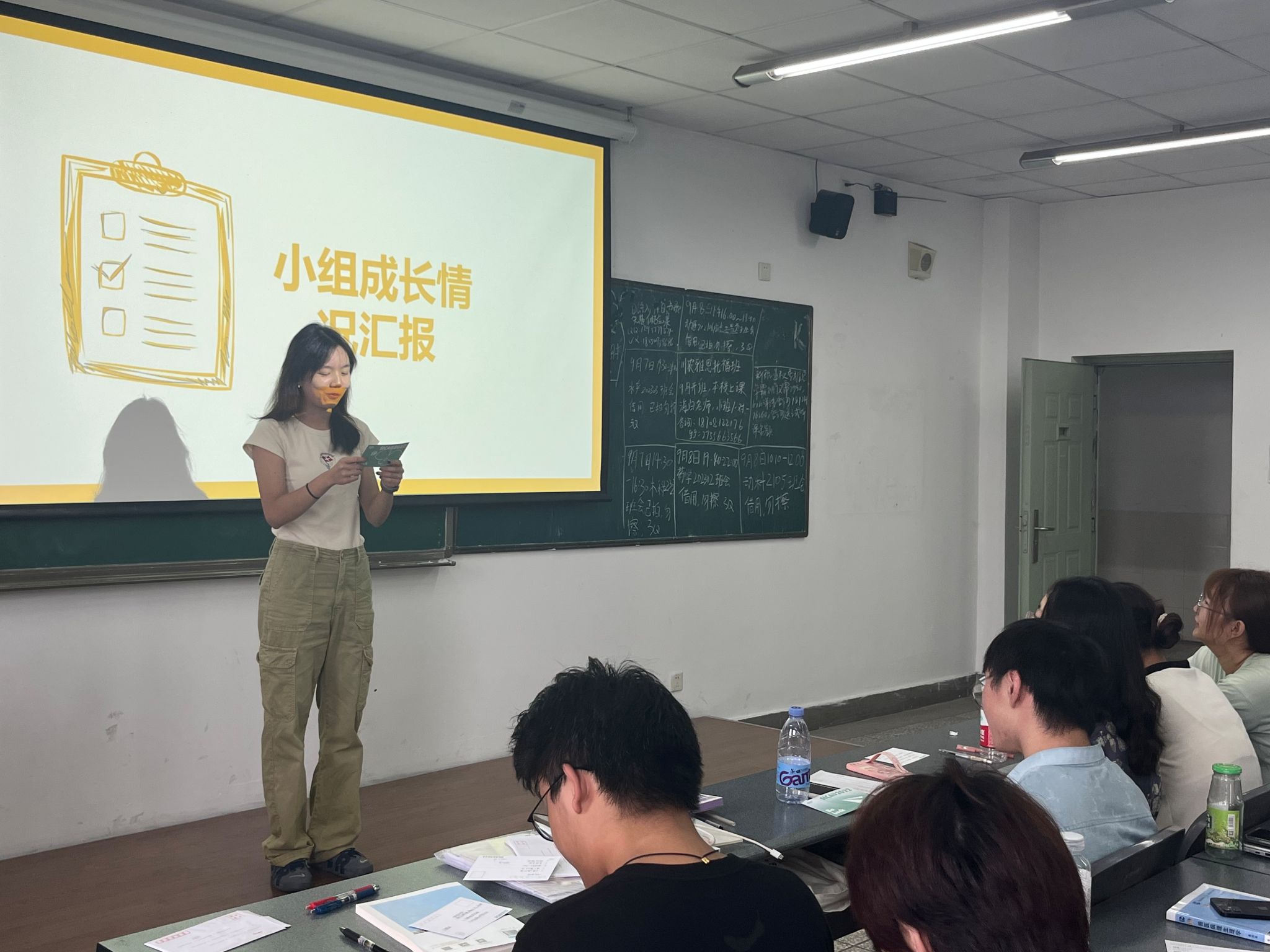 小班分组的代表郭颜、周俞年、刘俊丰、项雯婷依次进行了个人以及小组成长总结分享。郭颜讲道:“转专业的一年确实很辛苦,一开始繁忙的课程与陌生的环境也不太适应,但在这一年的过程中,我也逐渐找到了平衡点,找回了学习的感觉,并且进一步提升了自己的能力。这一年大家都经历了许多成长与变化,迈向更好的自己。”小班同学将本学期目标写在明信片上,这些小小的明信片,不仅承载着班级同学对大三的期望,也寄托着其对新学期新开始的展望。主持人说道:“大三已然开始,进入高年级的我们会经历更多的变化,但一直不变的是我们会继续努力,争取在未来的学习中有更多的突破与进步。”