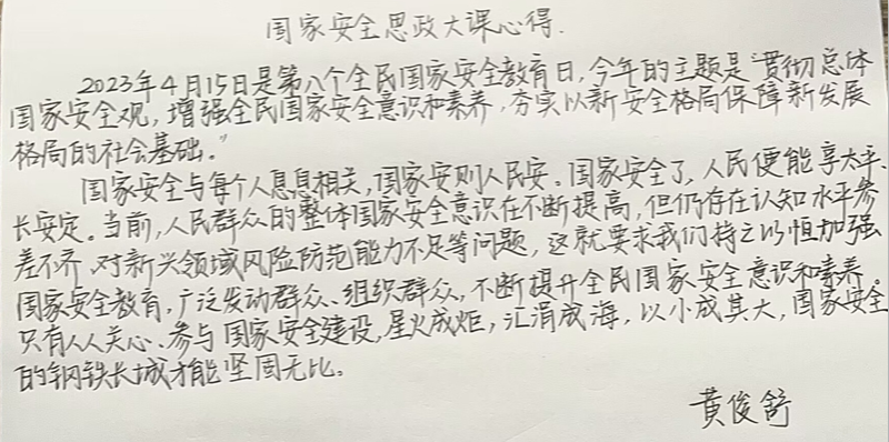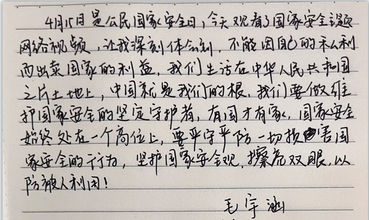 通过这次学习,我们更加明白了国家安全,你我都是受益者。虽然国家安全教育日每年只有一天,但安全问题却每时每刻都值得高度重视。国家安全、荣誉和利益高于一切,我们在行使自身权利的同时,不能损害国家和集体的利益。我们要做的是爱国,维护国家的荣誉和利益,不应触碰法律底线。保护国家安全,人人有责,更需要人人尽责,让我们共同构筑起保护国家安全的钢铁长城。