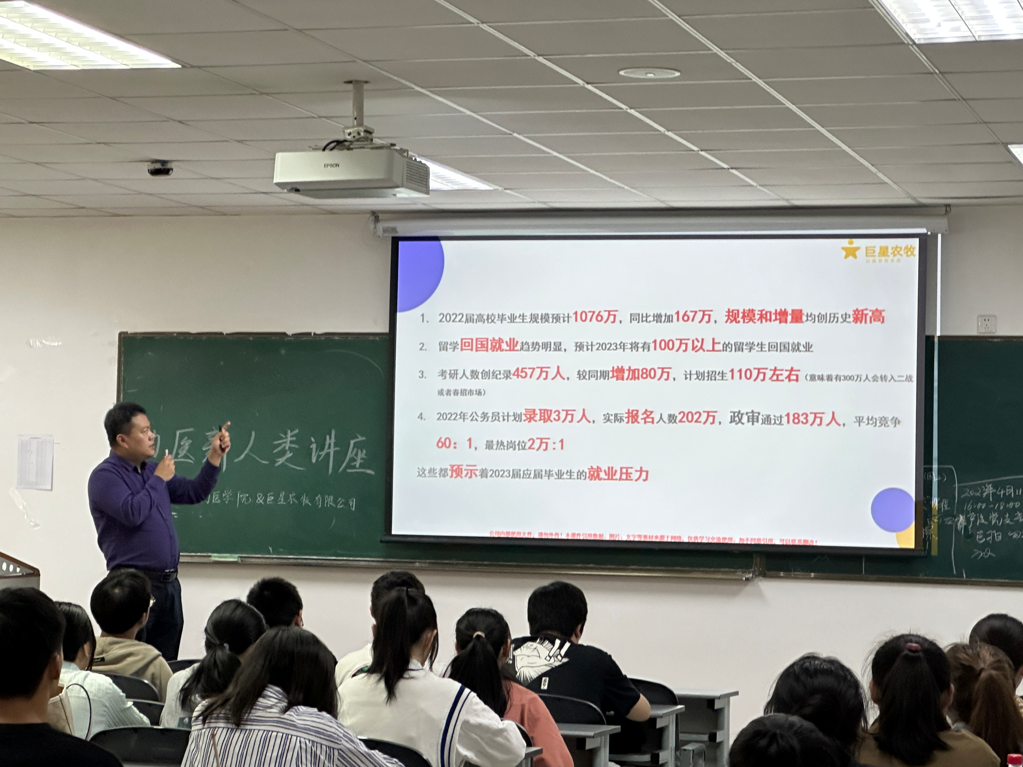 目前生猪养殖市场消费需求大,四川一省生猪出栏量位列全国第一,拥有极大的销售市场,行业发展极具潜力,而本行业所面临的“厚雪”则是小型企业成众,大型企业寡薄。为此,刘宏伟询问同学们:“是去大公司好,还是小公司好?”同学们各抒己见。刘宏伟结合自己多年的工作经验给小班成员进行解释,最终他建议大公司更适合应届毕业生学习知识,收获经验。