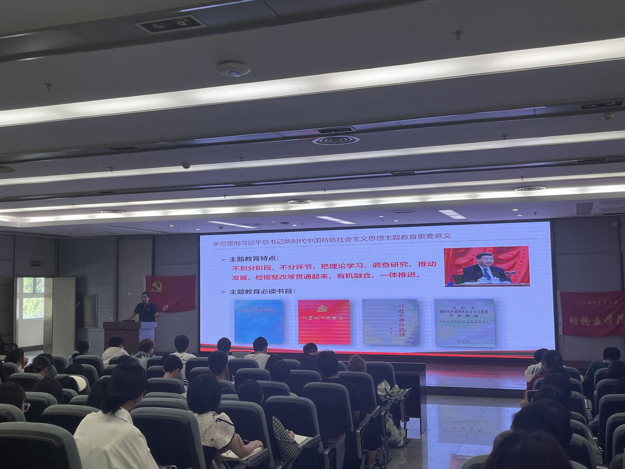 在本次党课中,贾仁勇书记结合自己的实际经历给队员们讲述了中国共产党从诞生至今走过的102年的光辉历程。这102年,是我们探索救国、图强真理、开辟民族独立和民族振兴道路的102年;是我们党不断发展壮大、以实际行动和辉煌业绩赢得人民群众拥护的102年。着重强调了学习贯彻习近平总书记新时代中国特色社会主义思想,并就党的二十大和全国两会会议内容进行讲解。其中提到学习贯彻习近平总书记新时代中国特色社会主义思想主题教育的意义,指出主题教育的特点:不划分阶段、不分环节、把理论学习、调查研究、推动发展、检视整改等贯彻起来,有机融合、一体推进。本次会议的最后,贾任勇书记向动医学子发出号召,做当代有志青年,坚定不移听党话、坚持跟随党的领导,为中国新时代特色社会主义建设添砖加瓦。