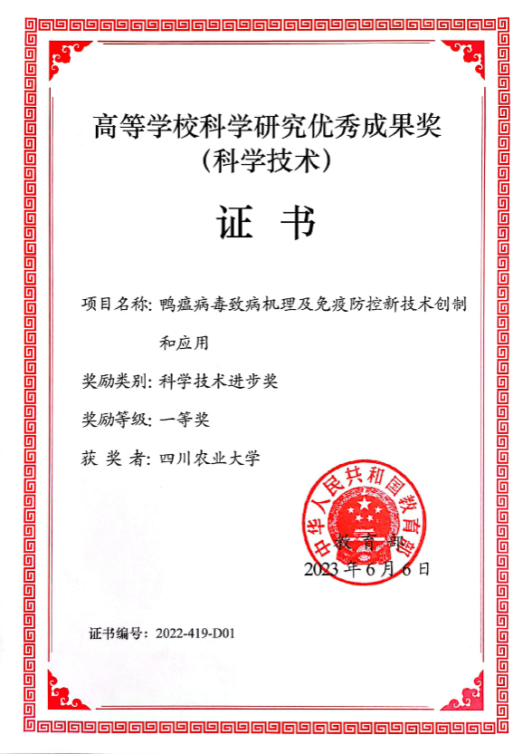 近日,教育部颁发了2022年度高校科学研究优秀成果奖,由冰球突破mg正规官网动物医学免疫学研究所程安春教授主持完成的“鸭瘟病毒致病机理及免疫防控新技术创制和应用”荣获科学技术进步奖一等奖。