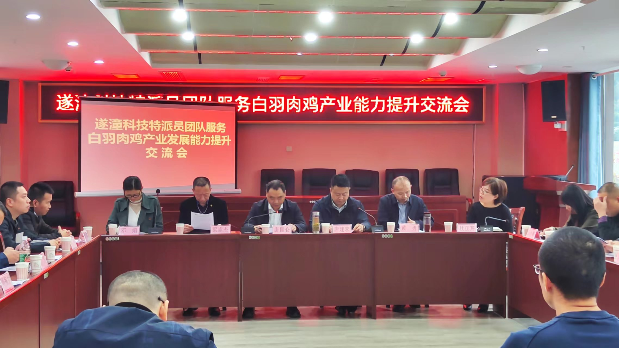 遂宁国家农业科技园区党工委书记唐昆仑出席并致辞,唐昆仑指出本次会议旨在成渝地区双城经济圈战略推动下,通过产学研的模式进一步推动遂宁、射洪白肉鸡产业高质量发展,推进乡村振兴。遂宁市农业农村局总畜牧师唐建宏同志介绍市科技特派员畜牧团队工作情况和全市畜牧产业发展情况。正大食品公司总裁杜正芹详细地介绍了遂宁白羽肉鸡养殖情况,同时也提出了公司在白羽肉鸡疫病防控方面遇到的难点问题,请在座科技特派员帮忙指导解决。