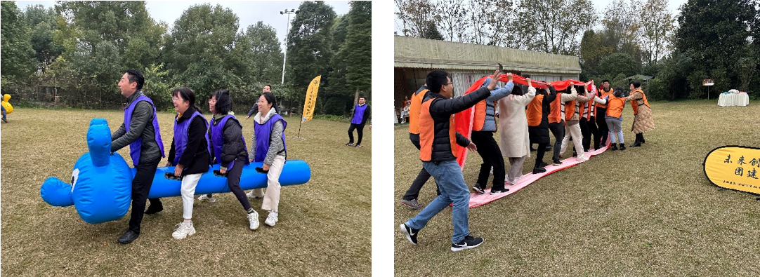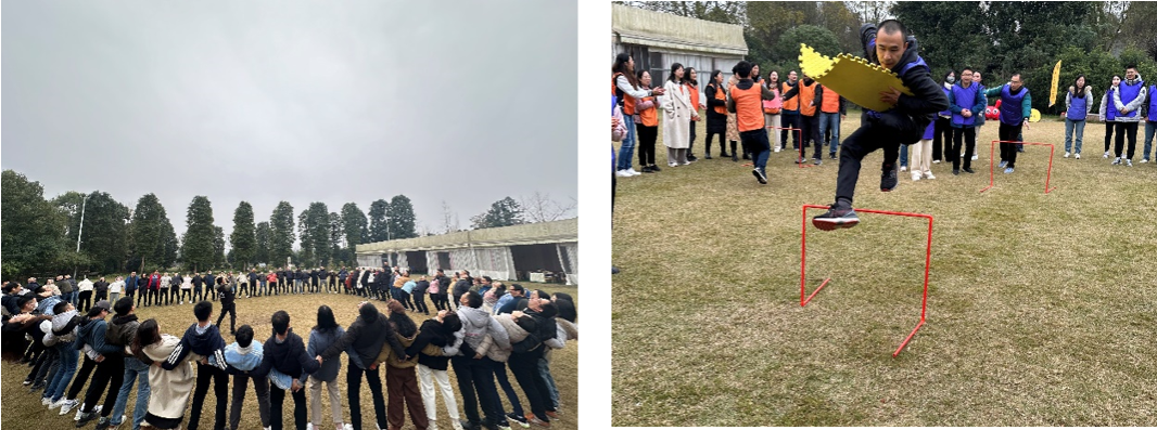 工会活动环节,在素质拓展营专业教练的带领下,全员参加四平八稳趣味跨栏、毛毛虫竞速、彩虹跑道等活动。这些活动旨在通过轻松愉快的方式增强教师的身体素质和团队合作精神。