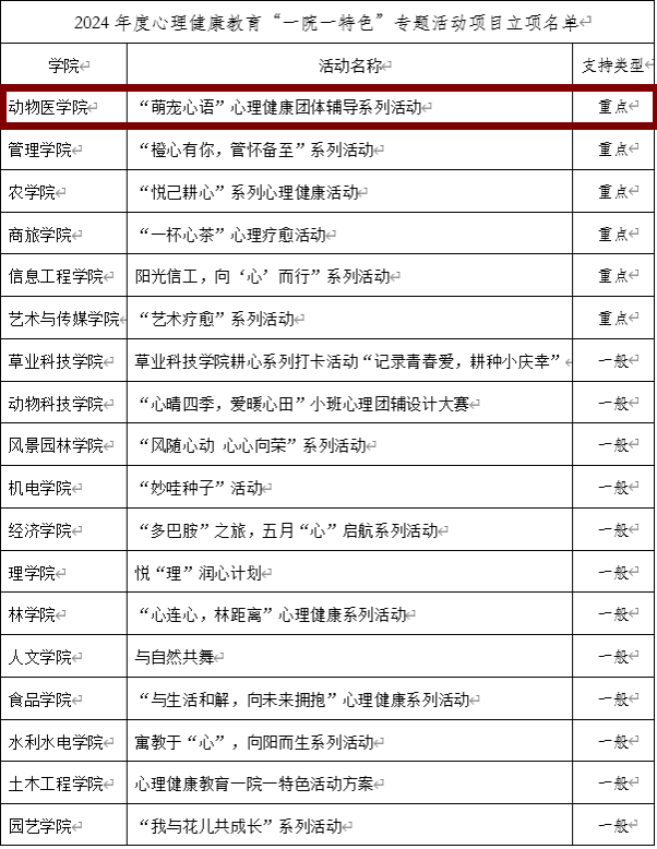 近日,学校心理健康教育“一院一特色”项目立项名单正式揭晓,冰球突破官网精心策划的“萌宠心语”心理健康团体辅导系列活动脱颖而出,荣获全校第一,并被评定为重点项目,获得学校5000元经费支持。