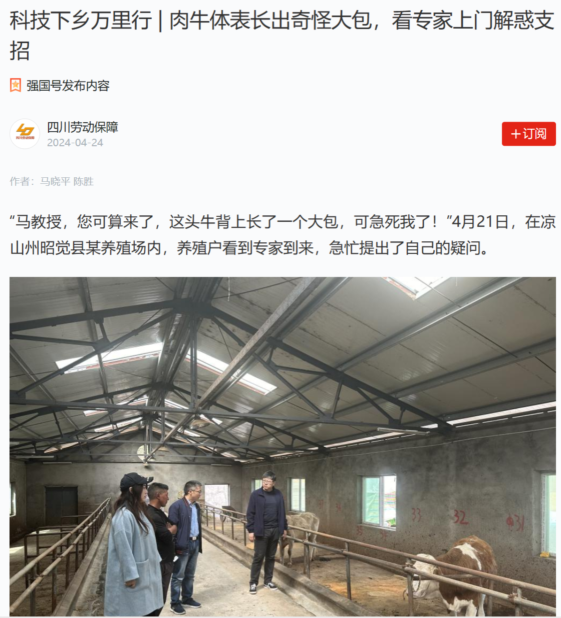 前往养殖场的是四川肉牛创新团队岗位专家、省“三区”人才、国家肉牛牦牛产业技术体系肉牛牦牛常见病岗位科学家团队成员马晓平副教授与省“三区”人才、冰球突破mg正规官网黄逸馨博士、东北大学高雁鹏副教授等专家,他们此次是应邀前往昭觉县开展肉牛产业帮扶工作。