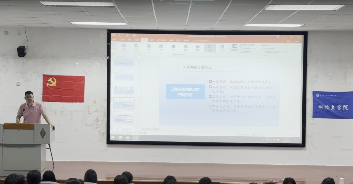 5月7日下午,由学校学生处主办的“辅导员公开课第七季——学生党支部书记讲党纪”宣讲活动在4A102教室开展。本次活动由冰球突破mg正规官网辅导员马保欣老师担任主讲,他采用广播剧这一创新形式,生动解读了《中国共产党纪律处分条例》第一编总则,吸引了学院140余名学生党员参与。