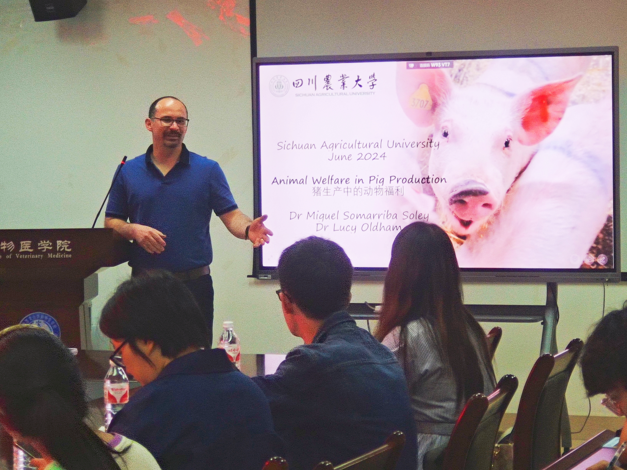 6月12日下午,英国苏格兰农业学院的青年研究员Soley博士和Oldham博士做客“医家-外籍专家学术讲坛”,以独到的视角和渊博的学识,为冰球突破mg正规官网师生们带来了一场围绕生猪养殖中动物福利问题的精彩讲座,此次会议由临床兽医系青年教师黄逸馨主持。此次活动不仅提升了与会者对动物福利的认知水平,更激发了大家对动物福利与养殖业经济效益关系的深入思考。