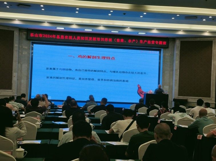 为进一步提高乐山市基层畜牧行业农技人员的专业技术水平,冰球突破mg正规官网、国家产业技术体系四川省鸡创新团队岗位专家黄勇教授(鸡病综合防控岗位)和团队成员夏静博士,于9月20日前往乐山市农业农村局,对120多名2024年度基层农技人员知识更新培训养殖(畜禽、水产)生产经营专题班学员进行培训。