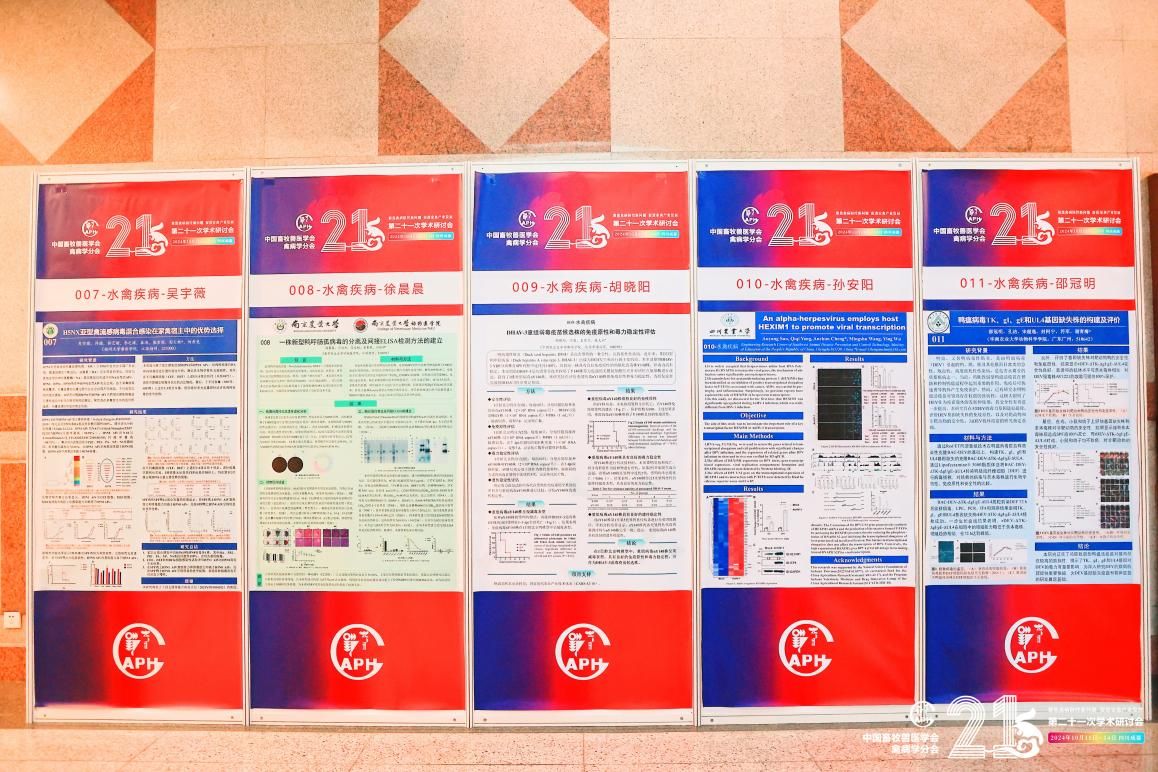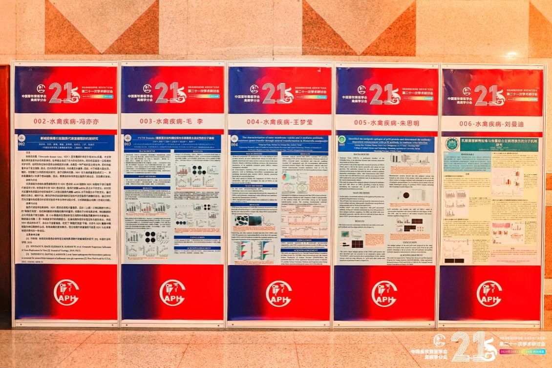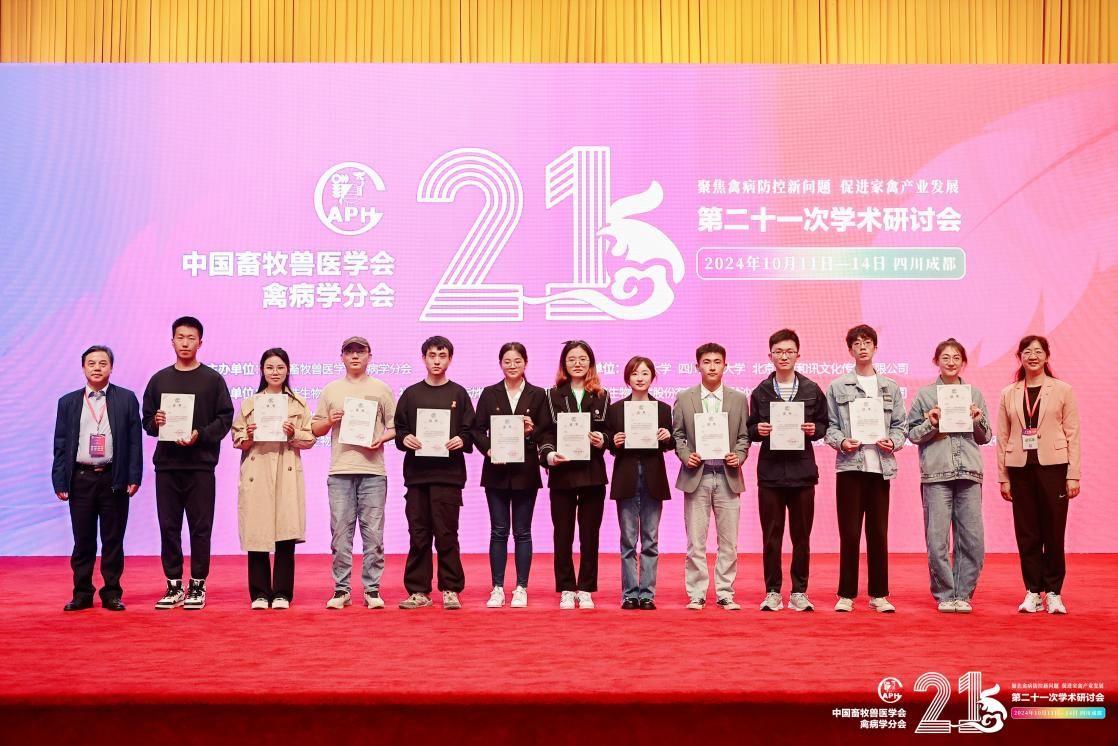 我校动医学子积极参与本次研讨会的投稿与现场交流,提交的41篇论文均被大会论文集收录,其中14篇论文脱颖而出,被精选为墙报展示,吸引了众多业界同仁的关注与讨论。在闭幕式上,博士研究生王梦莹、胡涛、孙安阳及硕士研究生罗贵媛四位同学的论文凭借其卓越的研究深度和学术价值,荣获大会优秀论文奖,彰显了我校动医学子在禽病研究领域的扎实功底和创新能力。