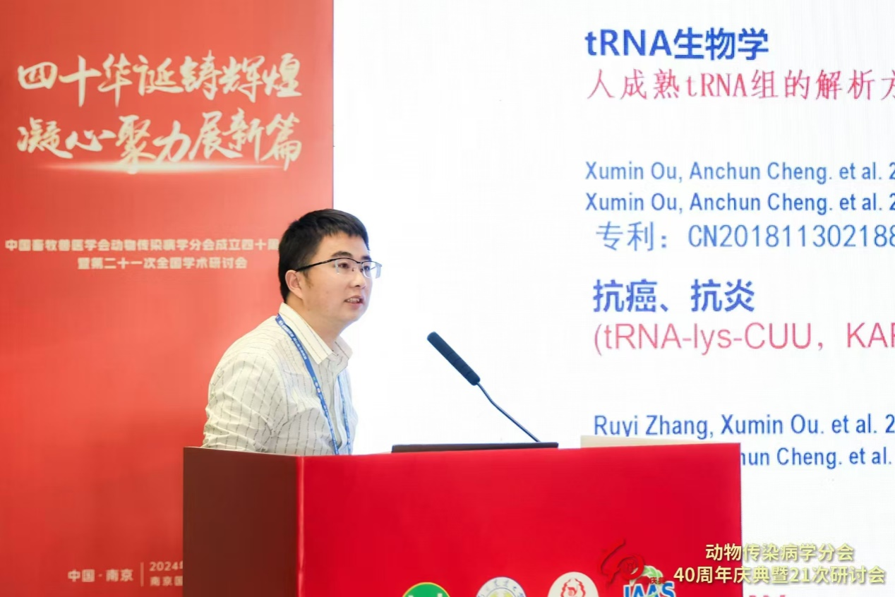 我校文心田教授、曹三杰教授、程安春教授、黄小波教授、刘马峰教授、王一平教授、杜森焱教授、赵勤副教授和欧旭敏等多名教师代表受邀参会。庆典仪式上,程安春教授获学会“卓越贡献者”称号,并作大会主题报告“鸭瘟病毒 US3 蛋白功能解析及其免疫学意义”。学院青年教师欧旭敏在禽病学分会场作报告“tRNA-Ser-UGA 调控鸭甲肝病毒经肠细胞快散播的分子机制”,获“优秀论文”奖。