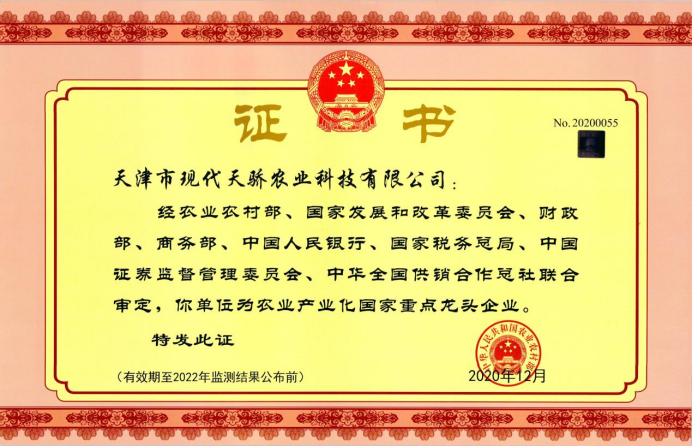 公司成立多年来,先后获得多项荣誉,2016年获得了国家高新技术企业认定,2020年获得了农业产业化国家重点龙头企业认定,2020年完成了信息化和工业化体系建设,全力打造智能AI工厂,坚定不移的走科技创新、联农带农、挂牌上市发展之路。